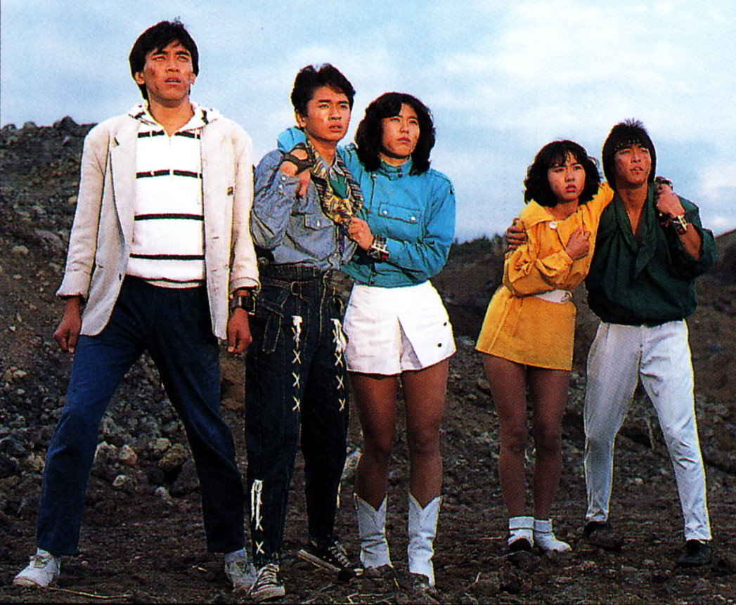 Nessa foto ficam claras duas coisas: primeiro, o ator que fazia o Akira (que infelizmente se suicidou em 2002) era realmente um gigante ao lado dos demais; e segundo, esses uniformes eram bem chamativos, parece aqueles adesivos brilhantes que colocam nos caminhões.